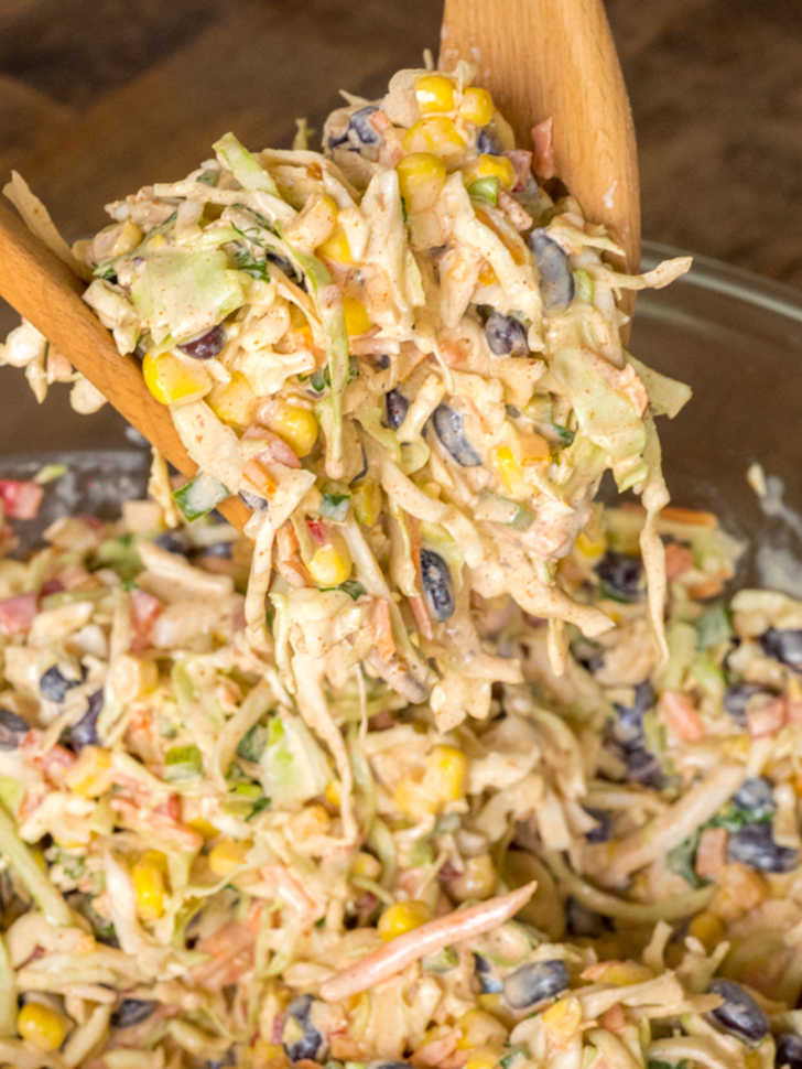 When you’re thinking about that pool party or backyard BBQ, and you’re wondering what you’re going to prepare that’s going to be easy to whip up and tasty enough to have everybody coming back for seconds, this Mexican coleslaw is the dish that’ll get you through the summer. While we’ll always love traditional coleslaw, we can’t help but feel that this one is way better, since it’s pumped up and chock full of color and flavor. Cabbage and/or coleslaw mix is still the base of this recipe, but we’ve thrown in a bunch of add-ins – corn, bell peppers, black beans, jalapeño and lime juice – that turn this into something special…trust us, you’re going to like this!